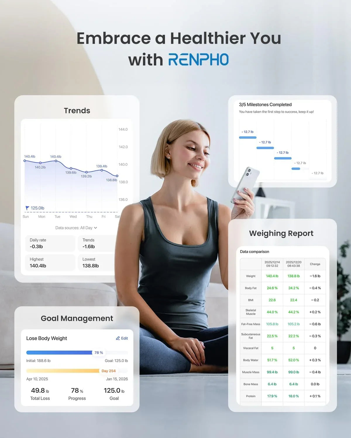 • 13 Essential Metrics: Tracks weight, BMI, body fat percentage, bone mass, and more directly through the Renpho Health app.